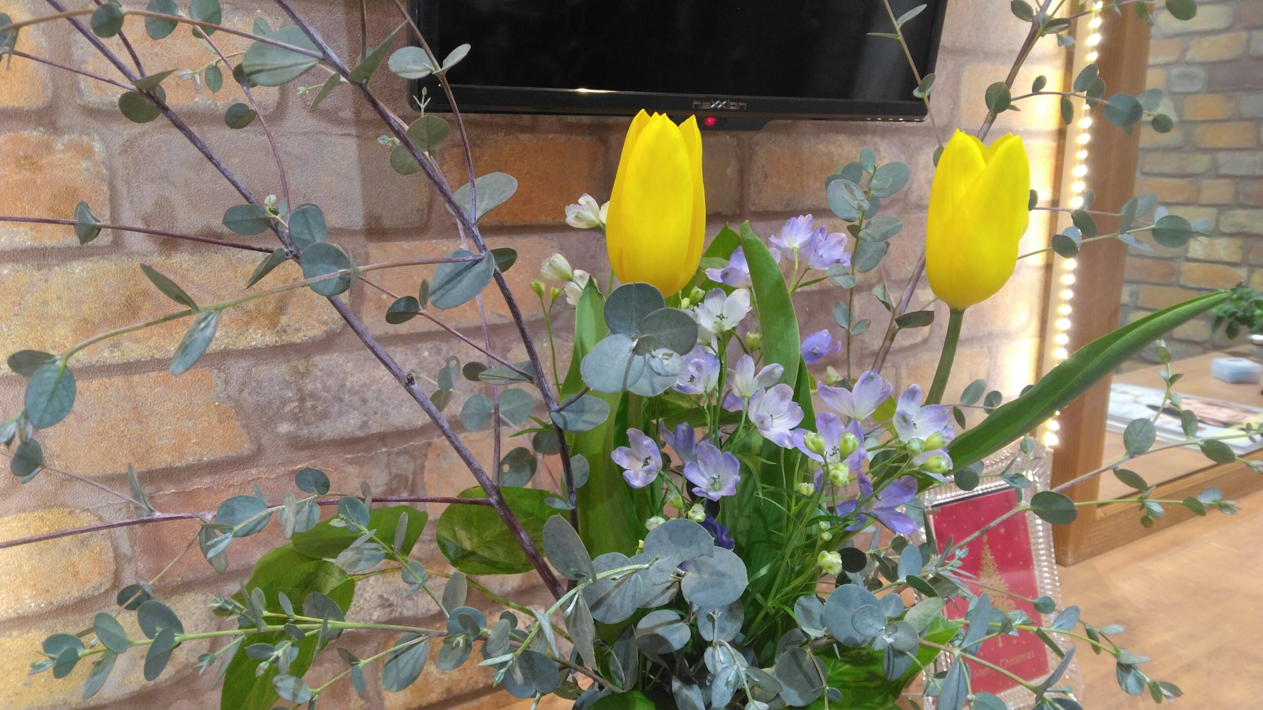 ユーカリ、チューリップ、デルフィニウム、レモンリーフです。