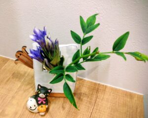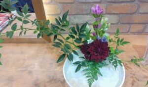 深紅のダリアを中心に、リンドウ、ソケイの盛花です。