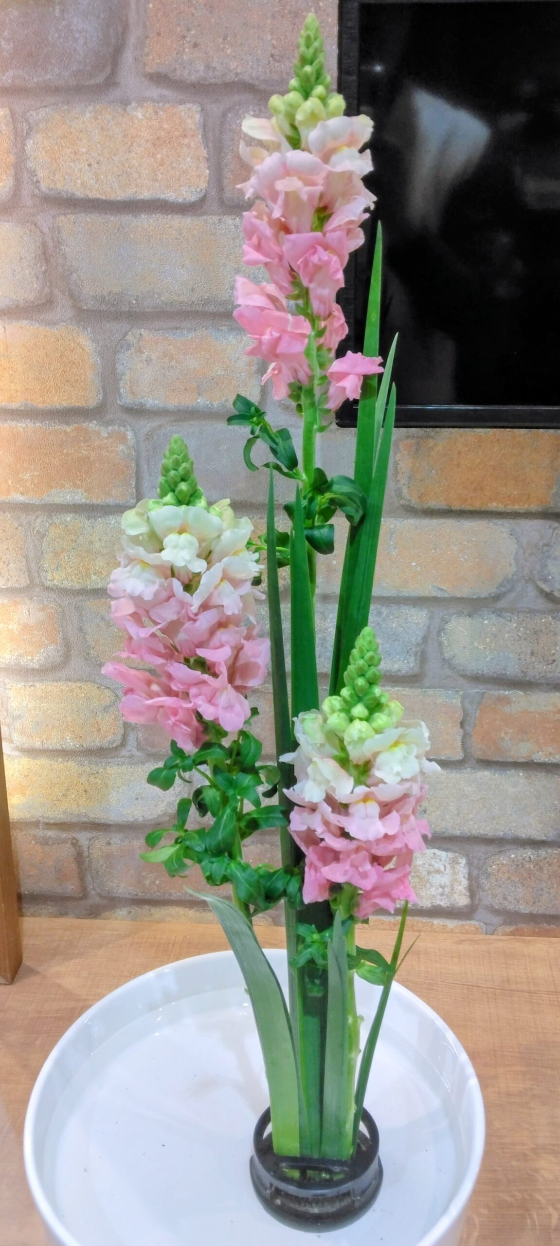 今週のお花は「金魚草とオクロレウカ」のお生花です。